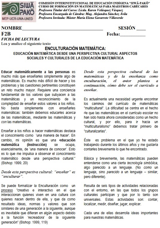 Gavarrete, M.E. (2009). Matemáticas, Culturas y Formación de Profesores en Costa Rica. Tesis de maestría no publicada, Universidad de Granada, Granada, España.