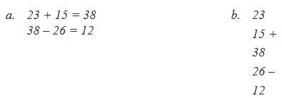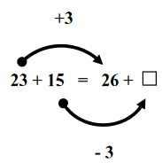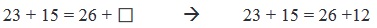 Another quite different solution would be the following: Since the relationship between 23 and 26 is 3 more, in order for both sides to be equal, it has to be a number that is 3 less than 15. Therefore, the number in the ''empty'' box must be: 15 - 3 = 12. We have called this kind of thinking relational thinking. The following diagram illustrates the relational thinking process as mentioned above.