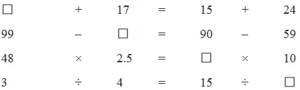 In each of the above examples, computational thinking requires the student to work out the ''known part'' of the sentence, that is 15 + 24; or 90 - 59; or 48 x 2.5; or 3 ÷ 4; and then to use the answer to this known part to calculate the value of the missing number. In the third question, for example, having obtained 120 as the result of multiplying the two known numbers, the student has to think about the numbers on the other side of the equal sign, asking ''What is multiplied by 10 to give 120?'' or ''If I divide 120 by 10 what do I get?'' - leading to an answer of 12. This kind of computational thinking is both accurate and efficient, but it is fundamentally different from relational thinking where the focus is on the whole sentence - and its two equivalent parts - and identifying a pattern of variation based on the operations involved (see Irwin & Britt, 2005). To illustrate relational thinking in the third sentence, Irwin and Britt (2005) suggest that a student might reason as follows: ''I can see that 10 is four times 2.5, so for both sides to be equivalent, the 48 has to be divided by 4. The missing number is therefore 12.''