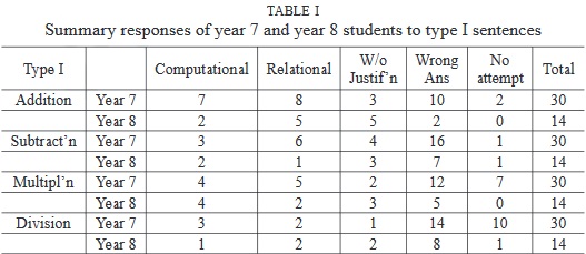 In Table I below, we present a summary of students' responses to Type I sentences for Addition, Subtraction, Multiplication and Division. For each operation, the responses are classified under five headings: Computational where students showed clear evidence of carrying out a computation leading to a correct answer for the missing number; Relational where students showed clear evidence of using relational thinking to obtain a correct result; Without Justification where students wrote a correct answer but failed to give any explanation; Wrong Answers whether as a result of attempted relational or computational thinking, or with no accompanying explanation; No Attempt where the question was left blank. The numbers in Table I below represent a summary response across the four sub-questions for each operation using Type I sentences.