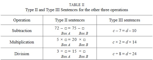 Two consequences follow from what may appear to be an inconclusive analysis of these responses to Type I sentences. The first is that a differently designed sentence is needed in order to carry out a more in-depth study of students' relational thinking. For this reason, we decided to include sentences, hereinafter called Type II and Type III sentences, in the questionnaire where students are required to express their thinking relationally, and also where the format of the questions limits the possibility of Without Justification responses. The second consequence is to remind teachers that, while Type I sentences have certain limitations when used in a research questionnaire, their potential in teaching and learning is too important to neglect. Their pedagogical value in giving students alternative pathways to demonstrate why their calculations are correct is too important to ignore. However, even more importantly from the perspective of this paper, Type I sentences allow students to ''generalize from the arithmetic model'', building up a deeper understanding of equivalence and how its interpretation and enactment depends on the operations being used. This benefits students' knowledge of number and number operations, as well as working towards algebra.