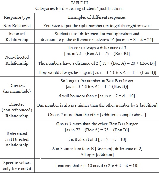In examining students' attempts at justifying their solutions to the Type II and Type III sentences, we developed a set of categorizations to describe students' answers. Apart from the Non-Relational category, the other categories show elements of Relational Thinking in different respects. As far as they are concerned, only the category, Fully Referenced and directed Relational thinking, describes a complete response. The others contain elements of relational thinking but fall short in one or more respects, as shown in the descriptions and examples given in Table III: