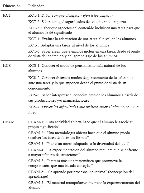 El análisis de contenido se realiza sobre la base del marco teórico referido (los subdominios del MKT y el instrumento de análisis CEAM) (Carrillo & Contreras, 1995). Con ese marco teórico como punto de partida, se elabora un listado de indicadores surgidos de la interacción entre los datos y los referentes teóricos mencionados que pretende describir qué aspectos del conocimiento matemático y los estudiantes, del conocimiento matemático y la enseñanza y de las CEAM se corresponden con las manifestaciones de los estudiantes. En el caso de los indicadores relativos a conocimiento matemático y los estudiantes, y conocimiento matemático y la enseñanza, se trata de concreciones de estos subdominios; en el caso de los indicadores CEAM se trata de frases hipotéticas que resumen las concepciones de los estudiantes. Este conjunto de indicadores es discutido por el grupo de investigación y una vez consensuado (ver listado definitivo en la Tabla I) se analiza de nuevo la información a la luz de los mismos.