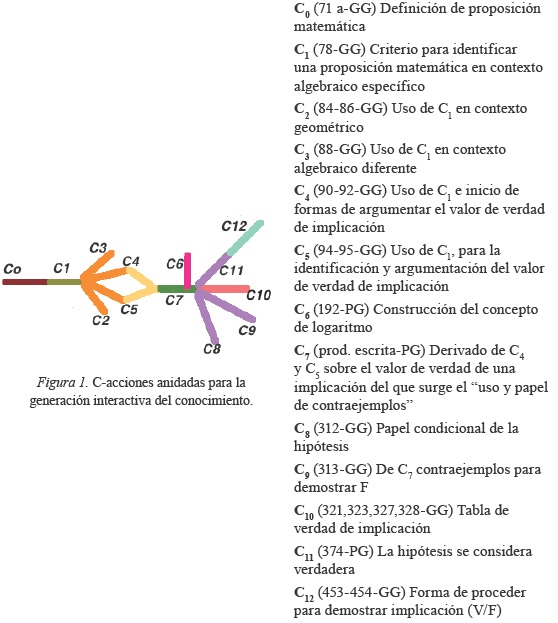 Se puede apreciar cómo inicialmente se identifica una proposición matemática ligada a un objeto algebraico particular, ax2+bx+c = 0 (C1). Esta construcción se retoma en otros contextos (C2, C3, C4, C5 y C8) lo que forma parte de un proceso de consolidación, dado que el constructo deja de depender del contexto en el que se ha generado y, se va fortaleciendo de manera paulatina y no limitándose a la tarea encomendada de decidir si se trata de una proposición matemática, sino que tratan de buscar argumentos para sustentar el valor de verdad de una proposición (C4, C5). Al revisar el criterio para decidir si es o no proposición matemática C1 se construye una nueva C-acción C8.