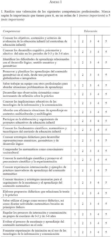 Se diseña un cuestionario ad hoc sobre la base de los actuales planteamientos del currículo oficial de educación infantil, las competencias para la formación de profesores propuestos por el Ministerio de Educación en el ámbito de las matemáticas y referencias bibliográficas analizadas. El cuestionario está basado en una serie de competencias profesionales necesarias para enseñar matemáticas, especialmente la Geometría. Los estudiantes para maestro debían realizar una valoración al inicio y al término del curso a través de una escala tipo Likert compuesta por 20 reactivos, donde tenían que indicar el grado de importancia de 1 a 5 sobre la serie de competencias profesionales enunciadas (Anexo 1).