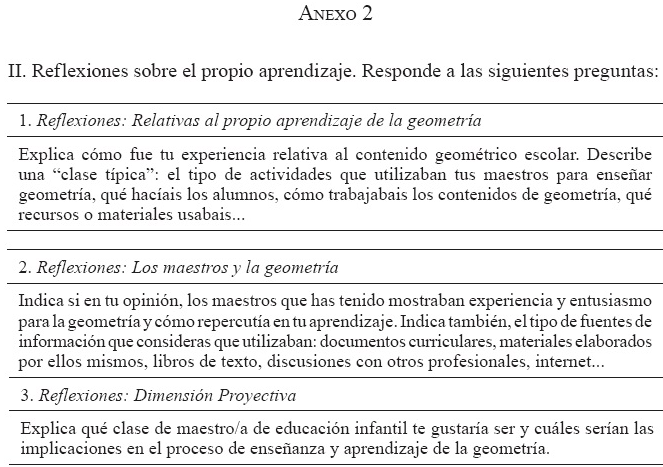 El segundo instrumento de recolección de datos diseñado para indagar sobre la identidad fue el ensayo reflexivo (Kumpulainen et al., 2009), comprendido como un instrumento que posibilita las manifestaciones de las identidades de los estudiantes para maestro. Para ello se elaboraron tres tareas en las que los estudiantes debían reflexionar sobre sus experiencias relativas a la enseñanza y el aprendizaje de la geometría, así como la dimensión proyectiva del maestro que ellos pretenden llegar a ser (Anexo 2).