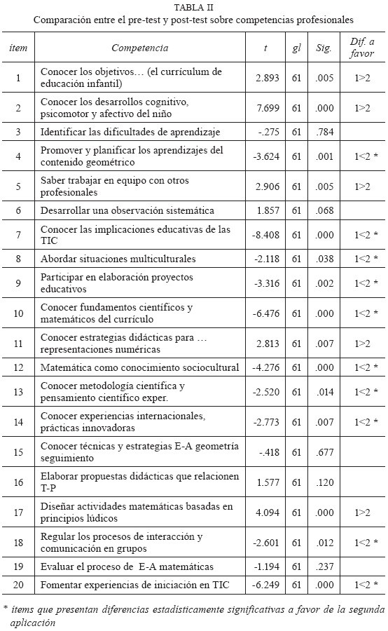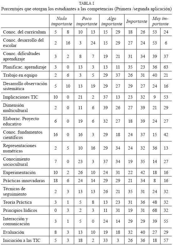 Al inicio del curso, los estudiantes para maestro consideraban más importante aquellas competencias profesionales relacionadas con el conocimiento pedagógico general. Así por ejemplo, un 53 por ciento de los estudiantes consideraba fundamental Conocer los objetivos, contenidos y criterios de evaluación de la educación infantil (el curriculum de educación infantil) y Conocer los desarrollos cognitivo, psicomotor y afectivo del niño en los periodos de 0-3 y de 3-6 años. Uno de los aspectos menos valorados por los estudiantes al inicio del curso fue la incorporación de las TIC, sólo un 10 por ciento de los estudiantes considera una competencia fundamental el Conocer las implicaciones educativas de las tecnologías de la información y la comunicación, y un 15 por ciento de ellos opina que es importante Conocer los fundamentos científicos, matemáticos y tecnológicos del curriculo de educación infantil. Asimismo, sólo un 18 por ciento de los estudiantes señala que Fomentar experiencias de iniciación en el uso de las tecnologías de la información y comunicación es una competencia fundamental para el ejercicio profesional. Otro aspecto que es escasamente valorado por los estudiantes (15 por ciento) es la Comprensión de las matemáticas como conocimiento sociocultural. De interés resulta que la mayor valoración mostrada por los estudiantes está referida a Diseñar actividades matemáticas basadas en principios lúdicos (68 por ciento) y Elaborar propuestas didácticas que relacionen la teoría y la práctica (48 por ciento).