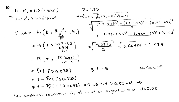 La Enviroment Protection Agency (EPA) ha establecido un estándar de calidad del aire para el plomo: 1.5 µg/m3. Las siguientes mediciones: 5.40, 1.10, 0.42, 0.73, 0.48 y 1.10, se registraron en el edificio cinco del World Trade Center en diferentes días, inmediatamente después de la destrucción causada por los ataques terroristas del 11 de septiembre de 2001. Después del colapso de los dos edificios del World Trade Center surgió una preocupación sobre la calidad del aire. Utilice un nivel de significancia de 0.05 para probar la aseveración de que la muestra proviene de una población con una media mayor que el estándar de la EPA, de 1.5 µg/m3. Justifica tu respuesta.