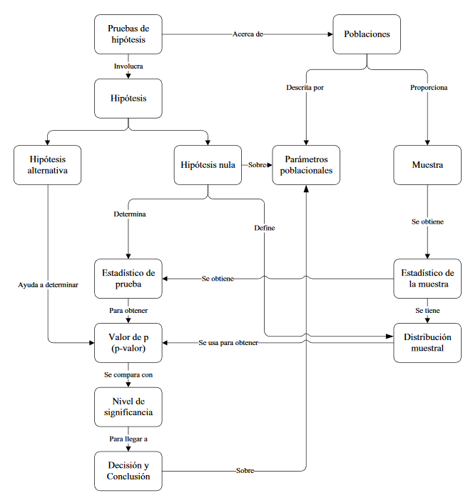 Las pruebas de hipótesis involucran diversos conceptos y términos que son necesarios comprender para su correcta aplicación e interpretación. Nos parece muy ilustrativo el mapa conceptual elaborado por Lipson (2000), donde se muestran los conceptos que intervienen en una prueba de hipótesis y la forma como estos se relacionan, desde una perspectiva híbrida de los enfoques de Fisher y Neyman-Pearson (ver Figura 1).