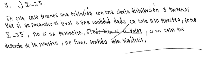Dos aspectos relevantes en el planteamiento de una hipótesis nula consisten en lo siguiente: la hipótesis nula hace referencia a un valor numérico del parámetro poblacional y la hipótesis nula se define como una igualdad respecto al valor supuesto del parámetro. El primer caso resultó más complicado pues sólo el 55% de los estudiantes lograron responder correctamente el ítem 3, en el segundo caso (ítem 4) sólo un estudiante tuvo dificultades para identificar la relación de igualdad de la hipótesis con el valor supuesto del parámetro. a continuación se muestra un ejemplo de respuesta correcta en el ítem 3: