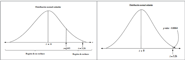 El valor Z0.95 = 1.645 que corresponde a un α = 0.05 representa el cuantil que define el límite de ambas regiones y para los datos del programa que se representan en dicha disiribución se tiene un valor calculado del estadístico de pruebaz =3.26 el cual cae en la región de rechazo de la hipótesis nula. Es decir, la muestra que se ha seleccionado ha producido un estadístico que tiene una pequeña probabilidad de ocurrir (p = 0.00064) partiendo de que es cierta la hipótesis nula, y es precisamente por ello que se le rechaza.