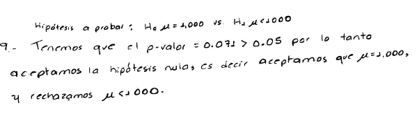 Finalmente, en el ítem 10 que trata de un problema abierto, nos propusimos obtener información de todo el proceso de prueba, desde el planteamiento de las hipótesis hasta la interpretación de los resultados. Sólo un estudiante desarrolló el proceso completo como se muestra a continuación: