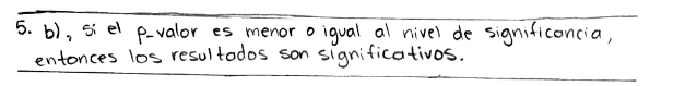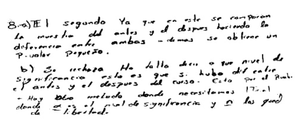 Por su parte, en cuanto al significado del valor de p y sus implicaciones en la significancia estadística, el 73% de los estudiantes mostraron una comprensión adecuada, no así en el caso de relación entre el tamaño de la muestra y el valor de p que resultó ser difícil para los sujetos de estudio (ítems 5 y 6 respectivamente). Un ejemplo de respuesta correcta se muestra a continuación: