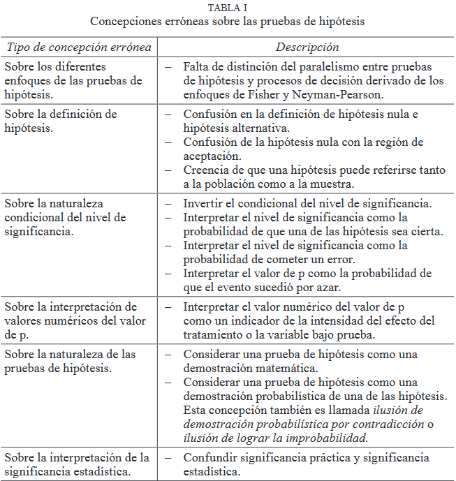 Los problemas de la enseñanza y aprendizaje de la inferencia estadística, particularmente de las pruebas de hipótesis, han sido poco estudiados hasta ahora por la investigación educativa, no obstante la complejidad y la importancia que representan en los cursos de estadística universitarios y en la aplicación en diversas disciplinas científicas. Castro Sotos, Vanhoof, Van den Noortgate y Onghena (2007) realizaron una investigación minuciosa en importantes fuentes bibliográficas para conocer las principales dificultades y concepciones erróneas que tienen los estudiantes universitarios sobre los conceptos de inferencia estadística. En dicha investigación encontraron sólo diecisiete estudios que proporcionaban evidencia empírica en un total de más de 500 artículos que fueron publicados sobre el tema en el período de 1990 a 2006. Dichos autores concluyen que muchas de las concepciones erróneas sobre las pruebas de hipótesis son derivadas de los libros de texto y que los profesores, incluso algunos estadísticos, comparten las mismas concepciones erróneas de estudiantes. En la Tabla I se muestran las concepciones identificadas por dichos autores acerca de los conceptos que intervienen en el proceso de una prueba de hipótesis.
