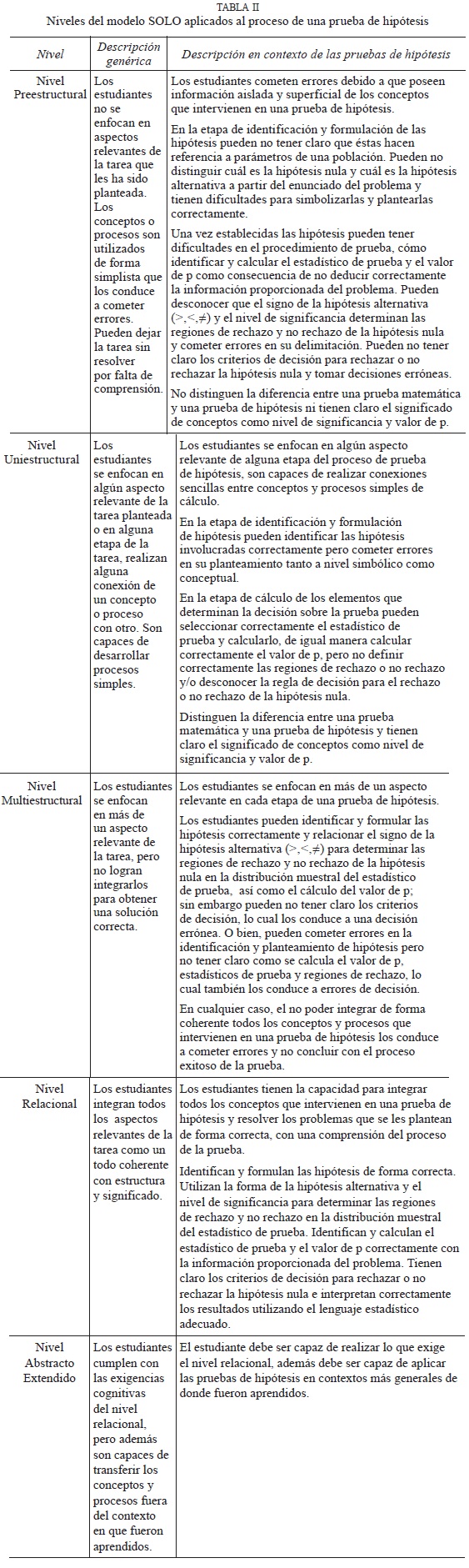 Para evaluar y caracterizar el razonamiento estadístico acerca de un concepto o grupo de conceptos se pueden definir categorías que delimitan particularidades de dicho razonamiento, los cuales a su vez permiten clasificar por niveles a los sujetos que desarrollan cierta tarea o resuelven un problema estadístico. En este contexto, el modelo taxonómico SOLO (Structure of Observed Learning Outcomes) desarrollado por Biggs y Collis (1982) ha sido utilizado para definir categorías de desarrollo cognitivo de diversos conceptos estadísticos (por ejemplo Pfannkuch, 2005; Vizcarra & Inzunsa, 2009; Reading & Reid, 2006). En el modelo SOLO los conceptos y procesos utilizados por los sujetos al dar respuesta a las preguntas o tareas planteadas se pueden clasificar en un determinado nivel de los cinco niveles que se contemplan. En la segunda columna de la Tabla II se describe cada nivel del modelo en forma genérica, mientras que en la tercera columna describimos el modelo adaptado para el caso de las pruebas de hipótesis.