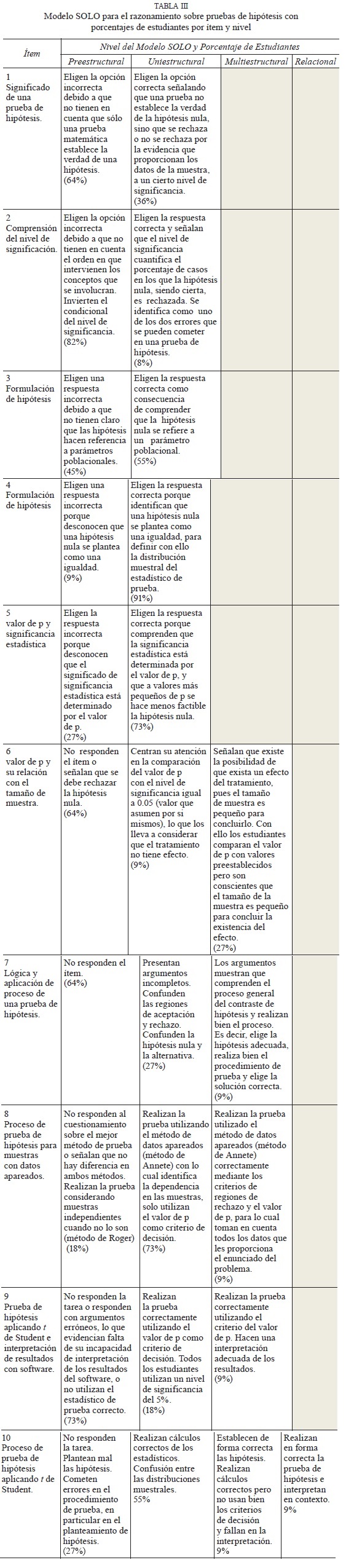 En la misma Tabla III se observa que en el primer grupo de ítems (1, 2, 3, 6, 7 y 9) se ubicaron del 9 al 36% de los estudiantes en el segundo nivel de razonamiento (nivel uniestructural), mientras que en el segundo grupo de ítems (4, 5, 8 y 10) se ubicaron del 60 al 90% de los estudiantes. En los ítems que fueron diseñados para mayores niveles de razonamiento (6, 7, 8, 9 y 10) se ubicaron muy pocos estudiantes en los niveles multiestructural y relacional. Es importante señalar que en los ítems 3, 4 y 5 se ubicaron del 54 al 72% de estudiantes en el nivel uniestructural, nivel máximo evaluado para estos ítems, por lo que fueron los ítems relativos a los conceptos de formulación de hipótesis y relación de valor de p con la significancia estadística los que tuvieron mejor desempeño.