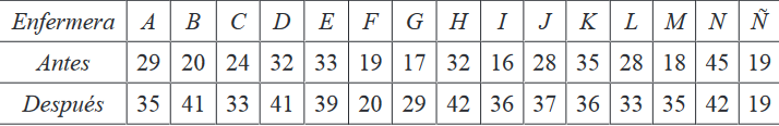 Los siguientes datos se generaron en un estudio de la eficacia de la formación del personal de enfermería. En este estudio, a 15 enfermeras se les aplicó un examen de conocimientos sobre el cáncer antes de asistir a un seminario de un día sobre el tema. Posteriormente se les aplicó el mismo examen sobre el tema al término de éste. Los resultados se muestran en la tabla siguiente:
