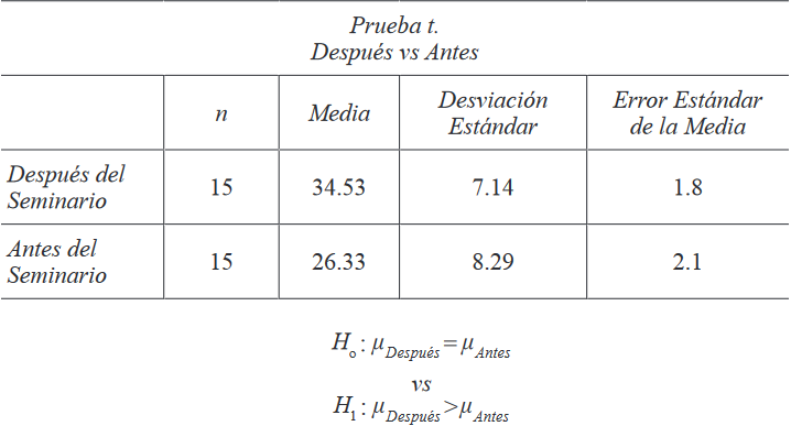 El organizador del curso quería saber si había habido un aumento en el conocimiento sobre el cáncer después de asistir al seminario. Dos asistentes, Roger y Annette, se dieron a la tarea de analizar los datos utilizando el software Minitab. Roger realizó una prueba t para con los siguientes resultados:
