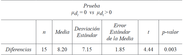 t = 2.90; p = 0.0036; grados de libertad = 27. Annette convirtió las dos filas de datos en una sola colocando solamente las diferencias (di ) de las puntuaciones y llevó a cabo una prueba t, obteniendo los siguientes resultados: