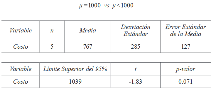 Con base en los resultados de esta prueba de hipótesis, ¿se justificaría que BMW anunciara que, en condiciones estándar, el costo promedio de reparación es menor de $1,000? Justifica tu respuesta.