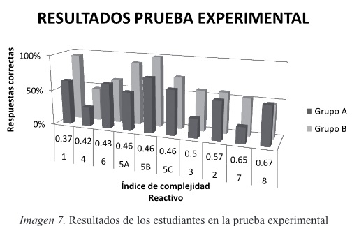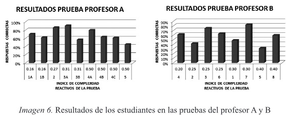 En las siguientes gráficas (Imagen 6 y 7) se registran los resultados de los estudiantes ante la prueba de su profesor y en la prueba experimental, los reactivos se representan en el eje horizontal de acuerdo al índice de complejidad y organizados de menor a mayor.