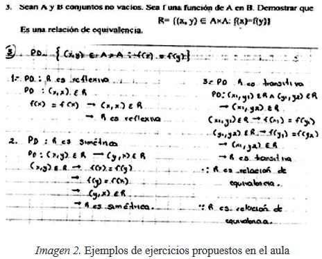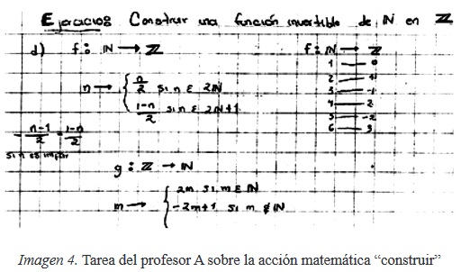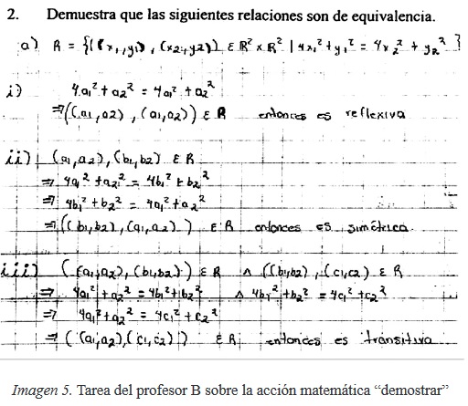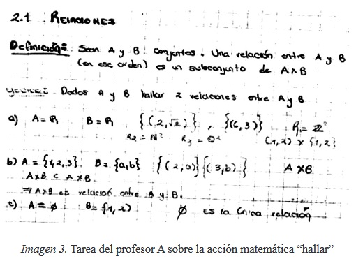 Respecto de las observaciones realizadas al interior de las aulas de los profesores A y B, así como de la revisión de los apuntes de sus estudiantes, se pudo dar razón del tipo de acciones o tareas matemáticas que los profesores solicitan y promueven en su práctica docente, a saber, "hallar", "construir" y "demostrar", como se ilustra en las imágenes 3, 4 y 5.
