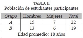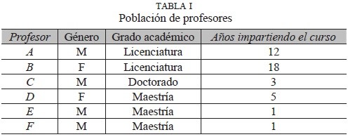 Participaron seis profesores de la citada Facultad que al momento se encontraban impartiendo el curso Álgebra Superior I. La información sobre su género, grado académico y años de experiencia en el ejercicio docente se presenta en la Tabla I. De estos, sólo tres pudieron responder una encuesta diagnóstica de opinión (Profesores D, E y F de la Tabla I) aplicada simultáneamente. Como los seis profesores componían un grupo académico en la Facultad, se decidió no aplicar nuevamente la encuesta a los otros tres profesores en un tiempo posterior para evitar posibles sesgos de información. Posterior a la encuesta y por invitación nuevamente, se obtuvo la participación y concesión de dos profesores (Profesores A y B de la Tabla I) para observar su práctica en el aula. Ambos fueron elegidos por tener mayor cantidad de años de experiencia docente. Asimismo se contó con la colaboración de dos grupos de estudiantes correspondientes a estos profesores. En la Tabla II se muestran los datos de dicha población estudiantil. Cabe indicar que los estudiantes colaboraron voluntariamente y no hubo algún tipo de compensación por su participación ni sanción en caso contrario.