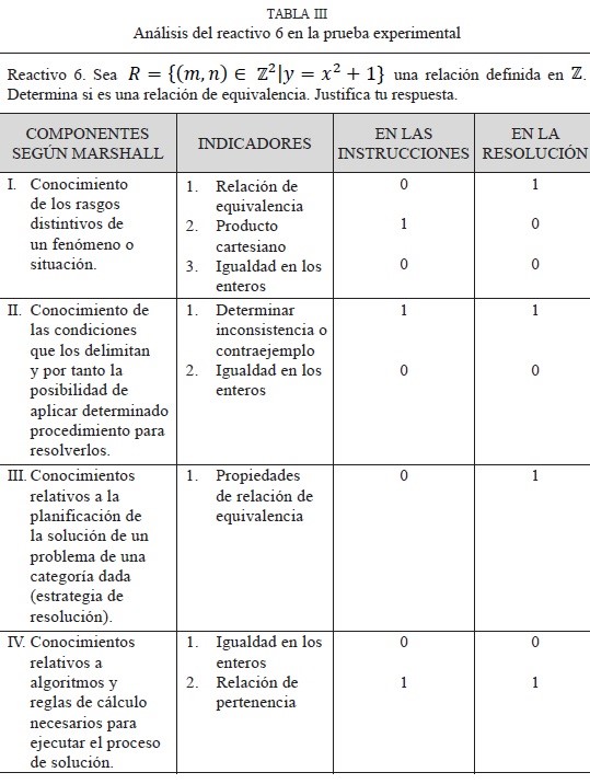Los índices de complejidad se ubicaron en el intervalo [0, 1], se empleó la técnica de dividir la cantidad de indicadores identificados en las instrucciones y los identificados en el proceso resolutivo entre el total de indicadores presentes en un reactivo. El valor resultante se usó para conjeturar si un reactivo era muy difícil (cerca del 1) o muy fácil (cerca del 0). Un ejemplo de esta técnica se presenta en la Tabla III con el análisis del reactivo seis de la prueba experimental. Se eligió este reactivo pues permite ilustrar indicadores asociados a cada uno de los componentes propuestos por Marshall y evalúa un contenido invariante en las pruebas aplicadas por los profesores en cursos pasados, es decir, valoriza un conocimiento central de la unidad temática abordada. El índice de complejidad obtenido del reactivo fue de 7/16 = 0.43, por tanto, se sitúa como un reactivo de mediana complejidad resolutiva. Los datos reales darían información sobre esta técnica y sobre la posibilidad de identificar a priori un nivel de aprendizaje logrado o deficiencias específicas de los estudiantes en las pruebas escritas.