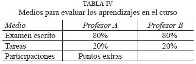 Por otro lado, al realizar observaciones sistemáticas al interior de las aulas de clase de los profesores A y B, en diecinueve sesiones de su curso, se obtuvieron datos sobre cómo evalúan los aprendizajes de sus estudiantes. Se identificó que un alto porcentaje de la calificación del estudiante para acreditar o no el curso queda determinado por el uso exámenes escritos, y un porcentaje menor a la realización y entrega de tareas individuales, tal como se indica en la Tabla IV.
