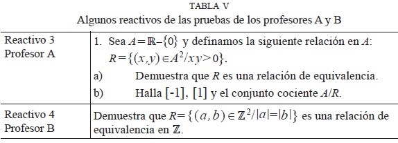 Por otro lado, al revisar el tipo de reactivos en los cuales los estudiantes manifestaron mayor y menor éxito resolutivo en las dos pruebas de los profesores A y B, se identificó que el mayor logro se obtuvo en el tema de relaciones mientras que el menor se obtuvo en el tema de conjunto cociente. Indagando si esto pudiera estar asociado con la forma (aspecto didáctico) en que ambos profesores desarrollan dichos temas en sus cursos, se procedio a revisarlo observado durante sus respectivas sesiones de clase y se halló que en ambos casos se incluyeron ejercicios con el mismo enfoque teórico y práctico que en el resto de los temas abordados en el curso. De ahí que el resultado pudiera entenderse desde la naturaleza misma del reactivo (contenido) y al revisarlos se pudo verificar que, por ejemplo, en el caso del reactivo donde salieron más bajo los estudiantes, se introduce una noción matemática que pudiera representar dificultades en los estudiantes, a saber, la interpretación de la notación