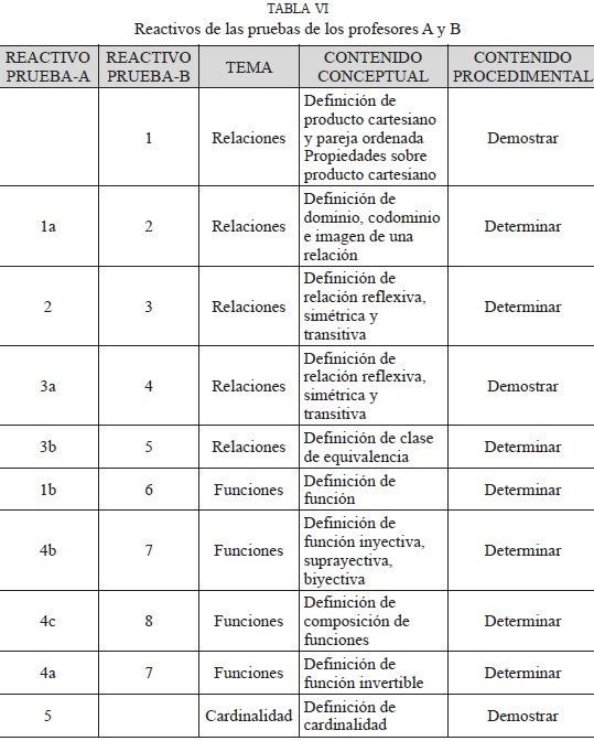En la Tabla VI se muestra información recabada sobre la forma en que los profesores A y B distribuyen los contenidos conceptuales y procedimentales en sus pruebas. Ciertamente se identifica un intento por incluir ambos tipos de contenidos, sin embargo, también se observa una marcada tendencia a valorar los contenidos de tipo procedimental, incluso cuando en el programa se declara lo contrario. Por la naturaleza del curso (Álgebra Superior I) se está obligado a advertir que aun cuando en las pruebas se visualiza tal tendencia, implícitamente se demanda movilizar contenido de tipo conceptual en las instrucciones de los reactivos.
