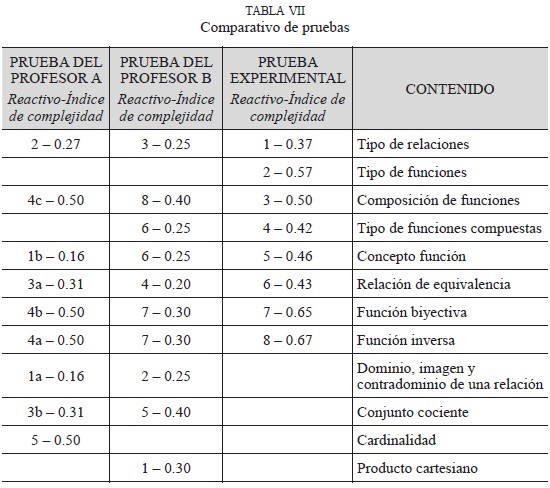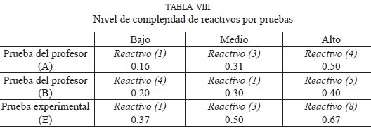 En la Tabla VII se muestra un comparativo entre los reactivos de tres pruebas escritas: la prueba del profesor A, la prueba del profesor B y la prueba experimental E, identificando reactivos que valoraban un mismo contenido, pero no necesariamente con la misma demanda. Además se señala un índice de complejidad cognitiva para el proceso resolutivo en cada caso.