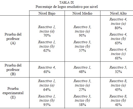 En la Tabla IX se muestran porcentajes de logros resolutivos alcanzados por los estudiantes participantes en cada uno de los reactivos indicados en la Tabla VIII, para cada prueba referida.