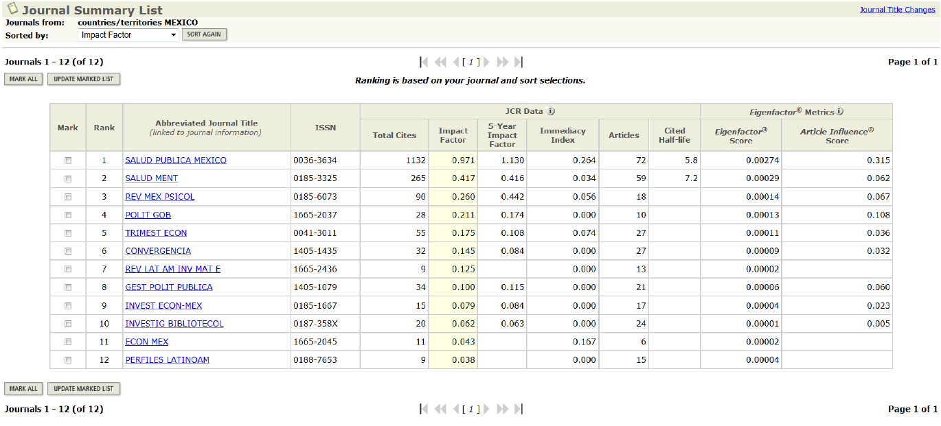 En la más reciente visita al JCR Social Sciences Edition del ISI Thomson, consultamos la relación de revistas mexicanas indizadas y ordenadas por factor de impacto. Como podrá apreciar el lector, Relime se encuentra ubicada en una posición bastante buena, sin embargo es posible mejorar si obtenemos más citas provenientes de revistas incluidas en el JCR. Ahora bien, en fecha reciente ingresaron cuatro revistas mexicanas más en Ciencias Sociales que aún no están en la tabla siguiente, estas son: Perfiles Educativos, Revista Mexicana de Investigación Educativa, Revista Mexicana de Sociología y Revista Electrónica de Investigación Educativa.