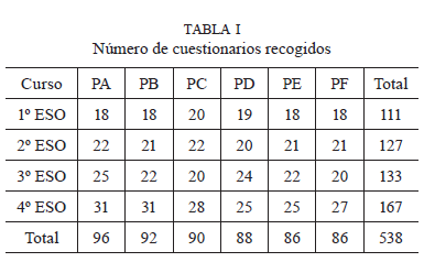 Los alumnos emplearon entre 15 y 30 minutos para contestar lo que se les pedía en cada una de las hojas del instrumento. La recogida de datos se llevó a cabo en dos centros de secundaria de la misma población, una ciudad de tamaño medio en el área metropolitana de Barcelona. Uno de los centros es público y el otro un centro privado concertado. La recogida de datos se realizó en clases de una hora, en las que los alumnos podían hacer propuestas a más de un problema. En el caso de que un alumno finalizara su propuesta para resolver el problema presentado en el cuestionario, la persona encargada de recoger los datos le ofrecía otro. De esta forma tenemos 538 propuestas de resolución de los 216 alumnos participantes en el estudio. En ningún caso, los alumnos recibieron una formación específica sobre estimación o modelización previa a este estudio. La tabla I muestra el número de cuestionarios recogidos por cada curso y cada problema en nuestro estudio.