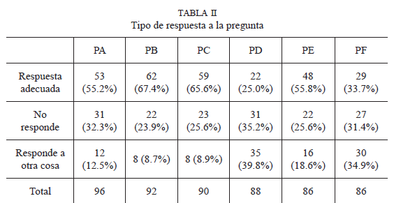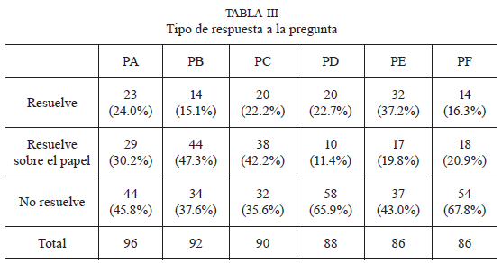 De la observación de la tabla II se desprende que la mayoría de alumnos hacen propuestas que van en la dirección de resolver la pregunta planteada, aunque no sean propuestas que permitan resolver el problema con éxito. Por lo tanto, podemos afirmar que los alumnos muestran un nivel de comprensión elemental de las situaciones descritas.