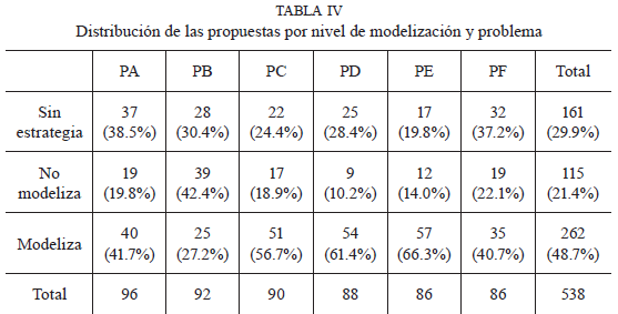 En relación con la modelización de las situaciones planteadas, la tabla IV muestra el número de cuestionarios codificados según su nivel de modelización para cada problema junto con el porcentaje que representan. Las propuestas que no contienen un plan de acción definido para encontrar una solución del problema, han sido categorizadas como “sin estrategia”. Aquellas propuestas que contienen una estrategia en la que no hay presencia de conceptos matemáticos o se hace un uso muy pobre de ellos, se han categorizado como “no modeliza”. Finalmente, se encuentran propuestas en las que hemos detectado el uso de conceptos matemáticos que forman parte de un sistema conceptual diseñado para describir la situación planteada, como puede ser el concepto de densidad de población o el uso de la regla del producto para contar elementos dispuestos en forma de matriz, así como los procedimientos necesarios para utilizarlos. Este tipo de respuestas son las que hemos incluido en la categoría “modeliza”. Dado que la recogida de datos se basa en la elaboración de propuestas de resolución (planes de acción), entendemos que no podemos afirmar que los alumnos modelizan realmente la situación estudiada, pero podemos observar si estas propuestas contienen algunos de los elementos (uso de conceptos, relaciones o procedimientos) presentes en los procesos de modelización.