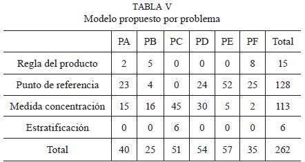 La tabla V muestra los modelos concretos que hemos detectado para cada problema. Podemos observar que el modelo de estratificación de la población sólo se detecta en el problema PC, que trata un aspecto estadístico (número de SMS enviados por persona) que, según el parecer de los alumnos, depende de la edad de cada persona. Por otra parte, la regla del producto sólo aparece en aquellos problemas en los que el objeto a contar puede ser claramente separado del total (personas o monedas), en cambio, no se detecta en los problemas PC y PD, en los que las gotas de agua y los vasos no se encuentran separados del total estudiado. Podemos observar que las medidas de concentración se han detectado en todos los problemas y el punto de referencia en todos, excepto en el problema PC, con lo que parece que son una opción interesante para trabajar, dado que los alumnos pueden asociarlos a diversas situaciones.