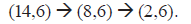En este punto el procedimiento termina pues ya hemos llegado a 0. Así, puesto que hemos hecho primero dos restas y luego tres, la antifairesis de 14 y 6 sería la sucesión (finita) {2,3}.