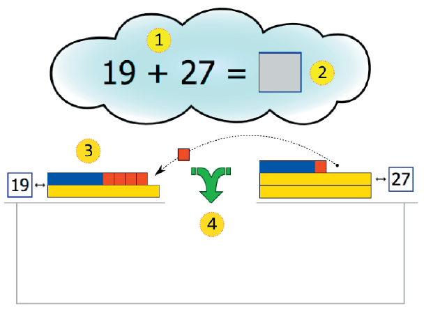 No sabe cómo calcular 19 + 27, por ejemplo, pero reconoce los números en la interfaz gráfica, manipula los bloques para completar, obtiene el resultado en forma icónica y es capaz de leerlo: «treinta y seis». No tiene gran dificultad para pasar de lo icónico a lo simbólico. Para el tránsito inverso, se apoya en metáforas monetarias (manipula dinero con familiaridad en la vida cotidiana): ¿Cómo entero 27 pesos con monedas? ¡Con dos monedas de 10, una de 5 y dos de 2 pesos!