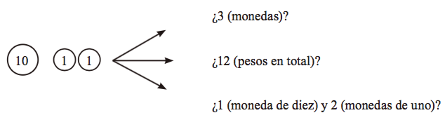 Con las monedas de $1 no tuvo problema, anotó un “2” en el lugar adecuado. Al preguntarle ¿qué número está debajo del $10? (estaba el 1), ella respondió: “el diez” aunque en seguida rectificó y afirmó que era el uno. Al pedirle que dijera cuánto dinero había en total, contestó correctamente: doscientos doce.