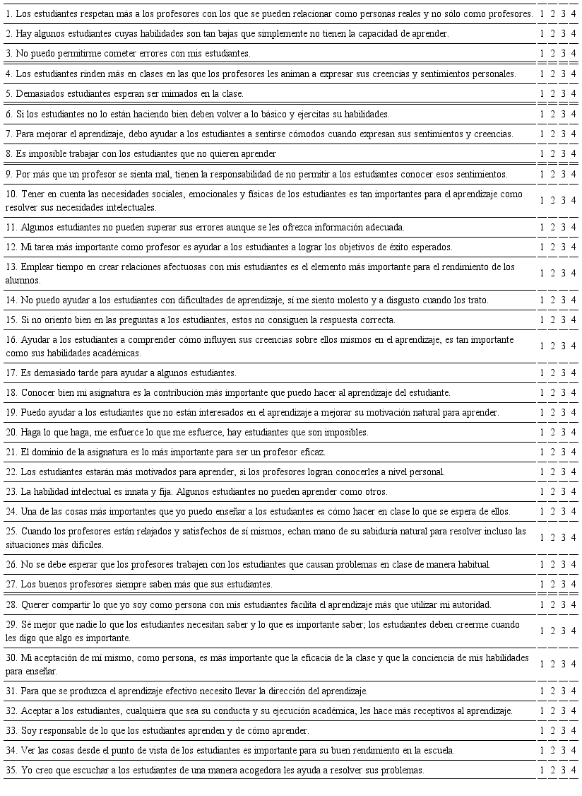 Uno de los instrumentos utilizados para medir las creencias hacia la educación y el paradigma en que los profesores basan su docencia fue el cuestionario de McCombs y Whisler (2000) (ver anexo II).