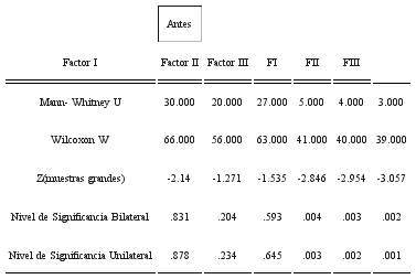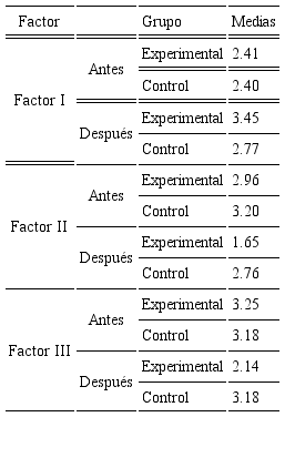 En la tabla II podemos comprobar que en el factor I las medias de los grupos estudio y control son muy similares antes del programa formativo pero difieren significativamente después del mismo. También podemos decir que el grupo experimental cambia hacia un enfoque de enseñanza centrado en el aprendiz (ECA) porque el factor I es mayor que 3 después del PFC (ver anexo II).