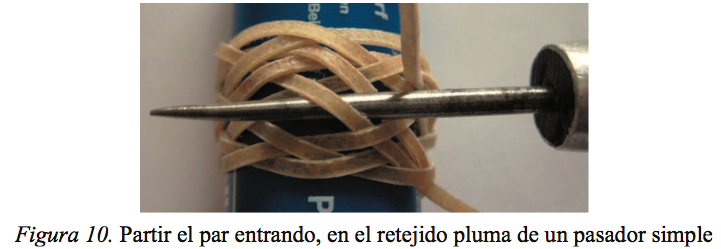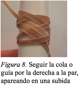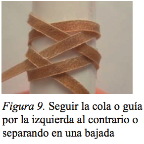 La idea del nivel superior consiste en tomar como referencia una de las vueltas anteriores que corre al lado (paralela) e ir siguiéndola siempre a la par (apareando): si esa vuelta tiene una pasada, por ejemplo Sobre 1, volver también Sobre 1 volver también Sobre 1 (Figura 8), o bien siempre haciendo lo contrario (separando) si la pasada correspondiente de la vuelta al lado es Sobre 1, pasar Bajo 1 (Figura 9). La imagen geométrica de paralelismo es el pilar del etnomodelo.