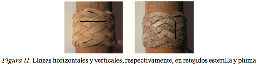 Este etnomodelo es, a nivel simple, el reconocimiento de los patrones geométricos que se observan en la trama de la obra-acabada (Alberti, 2007). Por ejemplo, la armadura completa es toda por uno y uno. En los retejidos terminados no resultan pares, el retejido esterilla tiene las líneas en horizontal y el pluma en vertical (Figura 11) porque se forman unas V cuyos vértices se alinean respectivamente por el ecuador (término artesanal para decir circunferencia) o por la dirección vertical del palito.