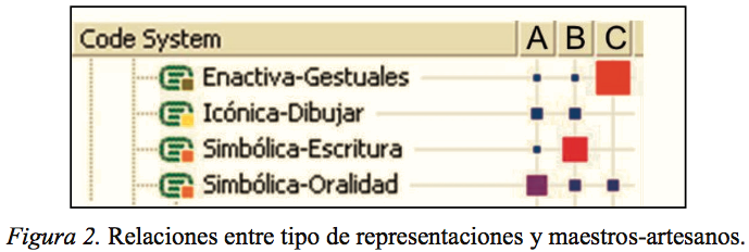 Presentamos en la Figura 2 la relación entre maestros-artesanos, en las columnas, y las representaciones manifestadas, en las filas. La dimensión y el color de los cuadrados en las celdas proporcionan una imagen visual de la presencia y frecuencia relativa de los códigos cruzados. Las observaciones sobre las entrevistas no están incluidas en esta Figura, pero se consideran en la interpretación.