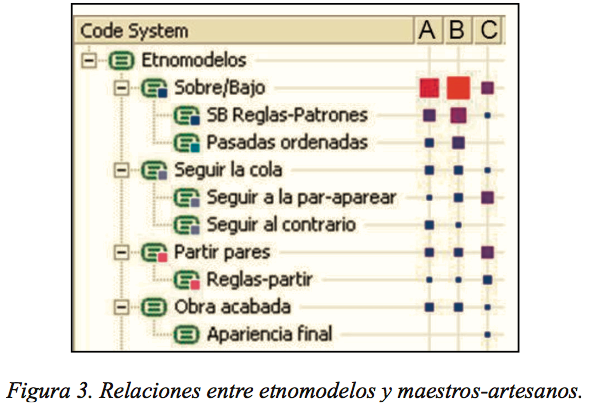 Además, en su nivel simple, este etnomodelo es el preferente en las manifestaciones de todos los maestros-artesanos y se emplea en todas las fases de la práctica por su versatilidad. En el nivel complejo está presente en el maestro-artesano A y es el más utilizado por el maestro-artesano B, como él mismo reconoce en la entrevista (Figura 3).
