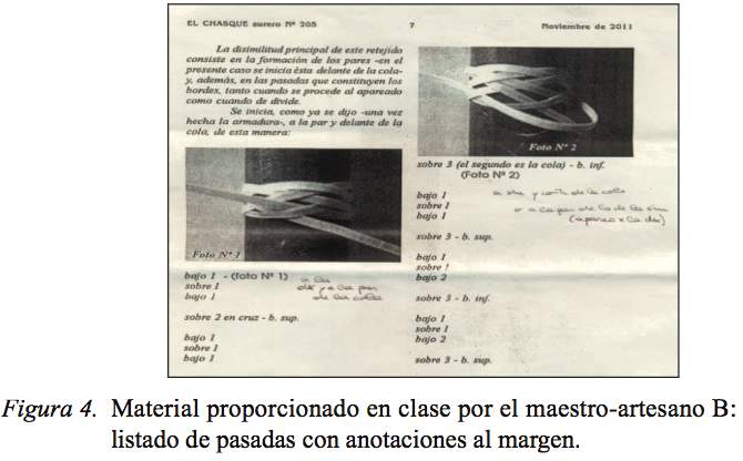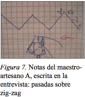 El maestro-artesanoA manifiesta prevalencia de representaciones simbólicas orales: sus indicaciones suelen consistir en reglas de procedimientos que la investigadora-aprendiz entiende por la enculturación en el lenguaje técnicoespecífico de la artesanía. Las representaciones enactivas se manifiestan durante las primeras clases y sólo al principio de las mismas, para que se entienda el mecanismo y después siguen indicaciones orales: utiliza la misma lógica de... Las representaciones icónicas y simbólicas-escritas son poco utilizadas durante las clases, la Figura 2 se refiere al recurso de material de la revista El Chasque surero. En cambio, en la entrevista, el maestro-artesano A responde activamente a la invitación de la investigadora de interactuar con representaciones distintas de la representación simbólica oral necesaria por el diálogo. De hecho realiza pasadores y sortijas para soportar sus explicaciones y representaciones simbólicas e icónicas escritas (Figura 7) en el cuaderno de notas de la investigadora.