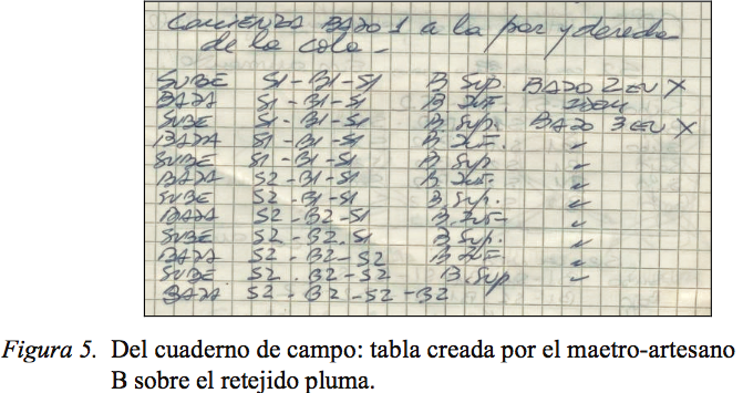 El maestro-artesano B manifiesta prevalencia de representaciones simbólicas escritas: se crea durante las clases material explicativo, tablas donde se ordenan las pasadas en subidas, bajadas y bordes (una realizada en el cuaderno de campo de la investigadora: Figura 5), lista de pasadas con indicaciones escritas (Figura 4); se recurre a fotocopias de materiales didácticos previos, a menudo con representaciones icónicas. El material fotocopiado consiste en artículos de la revista El Chasque surero, o material didáctico fruto de la colaboración del maestro-artesano B con A y con otros alumnos. Aclaramos que durante el análisis se decide codificar este material según quién recurre a él, explicándolo; cuando ya no hay necesidad de explicaciones por el éxito de la enculturación, el material se codifica según quién lo proporciona. El maestro-artesano B manifiesta preferentemente representaciones enactivas durante las primeras clases, éstas se van perdiendo a medida que se recurre más a las otras representaciones. A diferencia de las clases, durante la entrevista el maestro-artesano B no utiliza representaciones distintas a la representación simbólica oral.