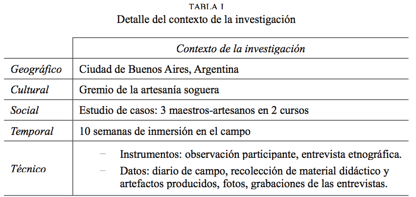 Se decide así la participación en cursos de artesanía, en donde la investigadora misma adquiere el rol de aprendiz, para comprender los significados que se construyen y se comparten en la interacción (Angrosino, 2012) a través de un proceso de enculturación y observar, en su entorno natural, estas interacciones.